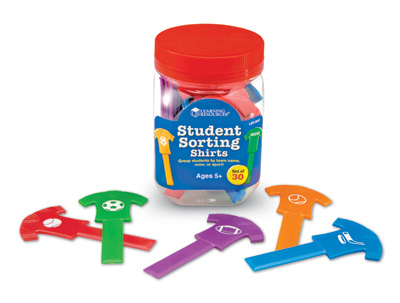 Shirts offer 3 different ways to group students. Set of 30 shirts includes 5 colors, 6 team names and 6 icons. Use a wet-erase marker to label each shirt with a student's name, then wipe off and reuse. Sports theme fosters teamwork in the classroom. Also great for early sorting activities. Includes plastic storage jar and Activity Guide. Plastic shirts measure 2.