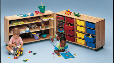 Two great storage units in one, and sized just right for little ones! One unit has adjustable shelves and the other unit comes complete with 16 Color trays. Hinges and clasp allow you to 'close' an area or add a padlock when security is a problem (padlock not included). 138 lbs (63kg). Tray measures 26cm L x 33cm W x 11cm H (10" L x 13" W x 4 1/2" H). Bookshelf measure 122 cm L x 30cm W x 66cm H (48" L x 12" W x 26" H). Unit with bins are 36cm (14") deep.