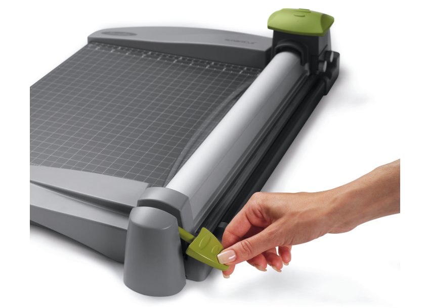 - Rotary trimmer conceals blade edges for safer use
