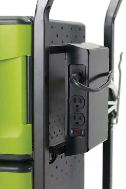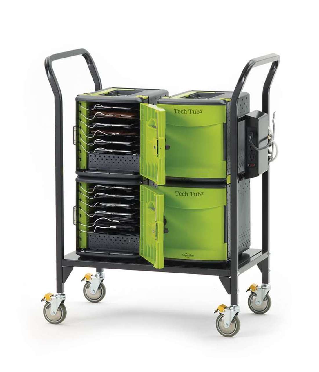 This mobile cart holds 4 Tech Tubs and can hold up to 24 devices. The tubs break apart using clips, the two lower tub sets are permanently connected together. The cart has two handles on each side for easy mobility. All tubs have a 3-point door lock with two keys, also with cable management on the back. The FTT624 is our other model that has a 10 outlet power strip to charge iPads.