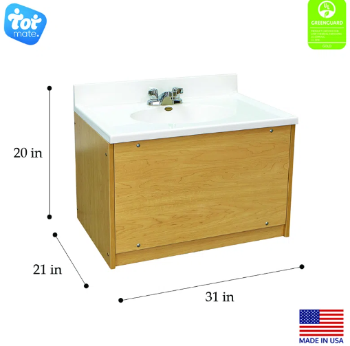 Give children a place to practise cleanliness and good hygiene with the Tot Mate TM8350R single laminate floor vanity. This vanity is constructed of durable laminate with recycled/reclaimed core materials and an attractive Maple or Shadow Elm Grey finish. It boasts a cultured marble top with an integral sink that will hold up well to wear-and-tear. The faucet and handles feature a chrome finish. Maintenance is made simple with a completely removable front access panel. This item comes unassembled. Specializing in the educational sector for decades, Tot Mate offers everything that you need for effective classroom storage and organization. With products ranging from lockers and book displays to play centers and mobile desks, Tot Mate boasts a comprehensive catalogue of classroom furniture. They utilize durable and easy-to-clean laminate construction with eco-friendly recycled materials as well as birch plywood for a natural wood look.