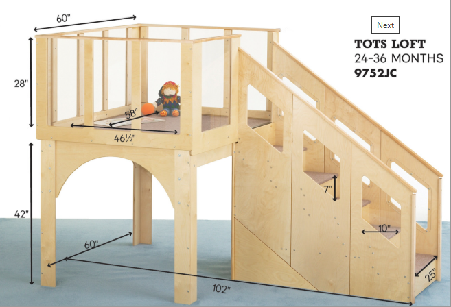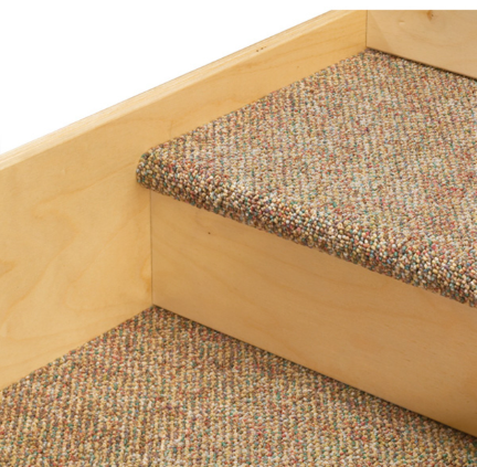 Encourage independent two through three year olds to climb to the top of their world. Clear acrylic panels provide safe viewing for children and supervisors. Design a dramatic play setting or reading nook under the deck. The five steps and roomy deck are carpeted. Steps: 25" wide x 10" deep x 7" high. Railing: 29"
