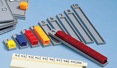Ten separate plastic holders that can hold cubes have been snapped into rods from 1 to 10.