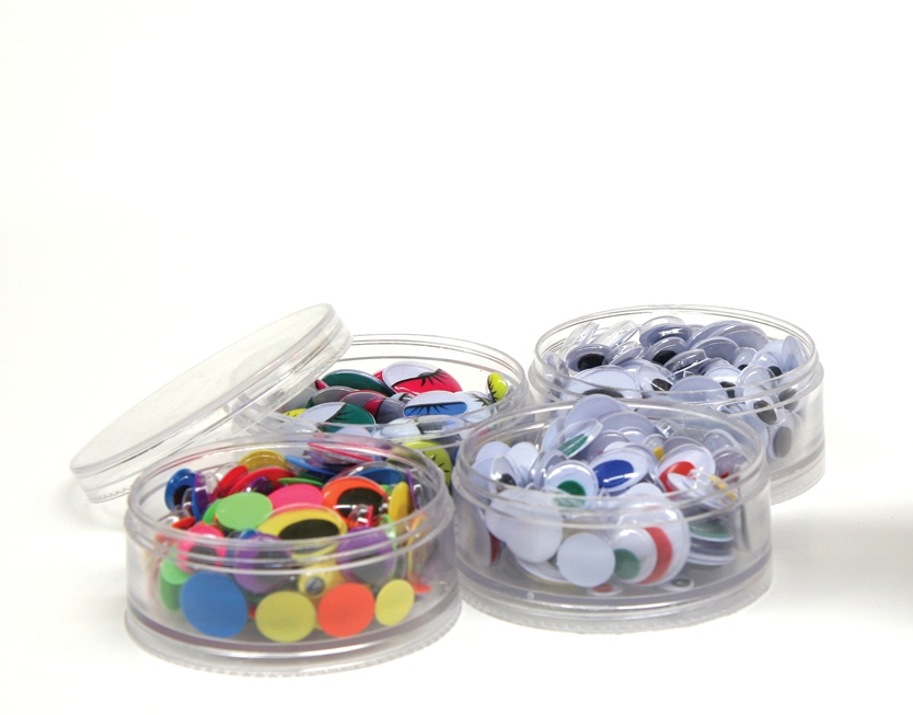Great for storing and organizing! This fantastic assortment comes with 5 unique sizes and shapes of Wiggle eyes, each individually packaged in its own reusable storage container. These screw-bottom containers feature a 4-tier pack (400 of Round Assorted, Black, Painted, and Bright Color eyes- each tier contains 100 Pcs) in the following sizes: