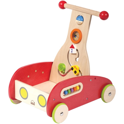 Features setback wheels providing a stable base for toddlers to pull themselves up. Includes abacus beads, tracker shapes panel, spinner, gears and blossom that works as a key to turn a tumbler of beads. Ages 1+